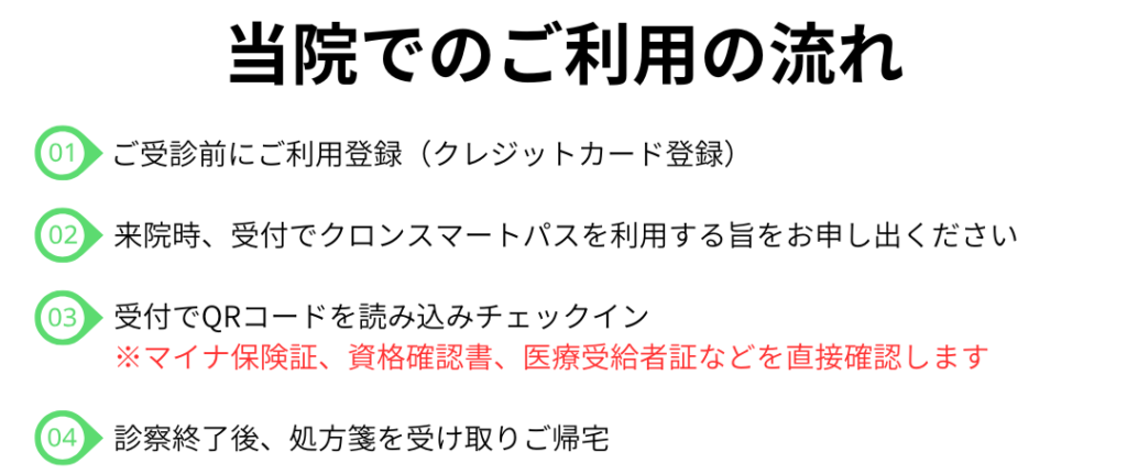 当院では患者様の通院のご負担を減らし、スマートに通院いただくためのサービス「クロンスマートパス」の導入をしました。