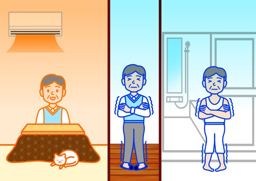 冬の日本では、暖かいリビングと、廊下、脱衣所、浴室といった暖房のない場所との温度差が非常に大きくなります。