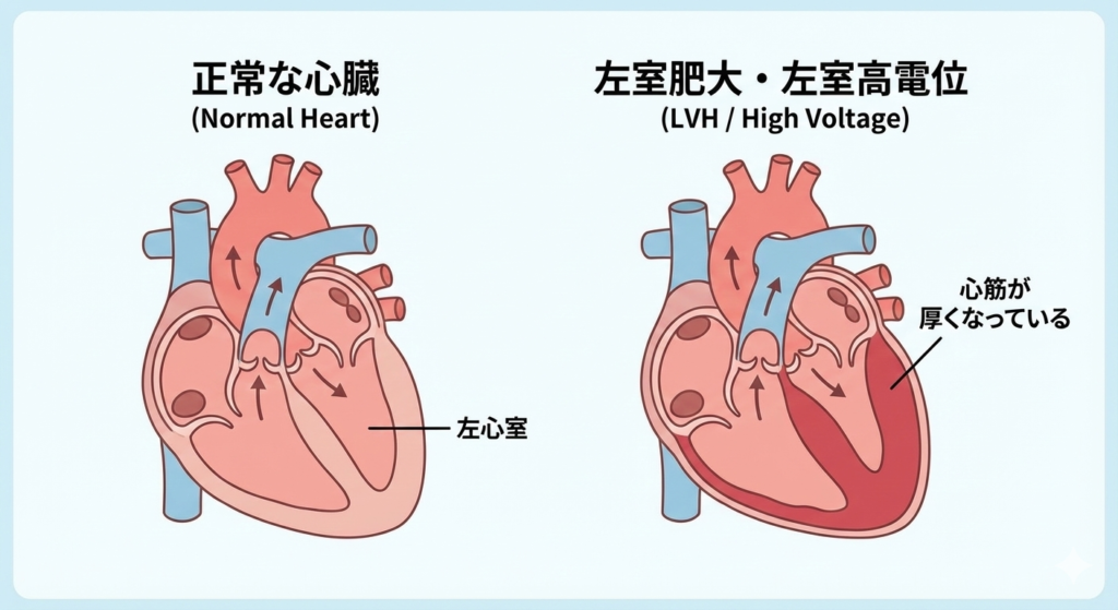 ここで最も重要なのは、「これは“心臓の形”を直接見ているわけではない」という点です。 左室高電位が出る理由として、主に次の2つのパターンが考えられます。