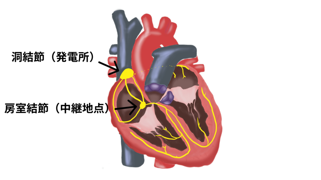 心臓の右上にある「洞結節(どうけっせつ)」という小さな発電所がスタートの合図を出し、その電気が中継地点である「房室結節(ぼうしつけっせつ)」を通って心臓全体に広がることで、ドクン、ドクンと拍動しています。