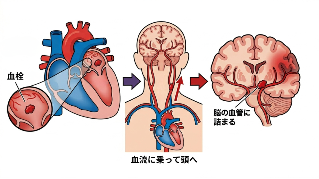 この血栓が血流に乗ってポンと脳へ飛んでいき、脳の太い血管をパツンと詰まらせてしまうのが「心原性脳塞栓症」と呼ばれる恐ろしい脳梗塞です。